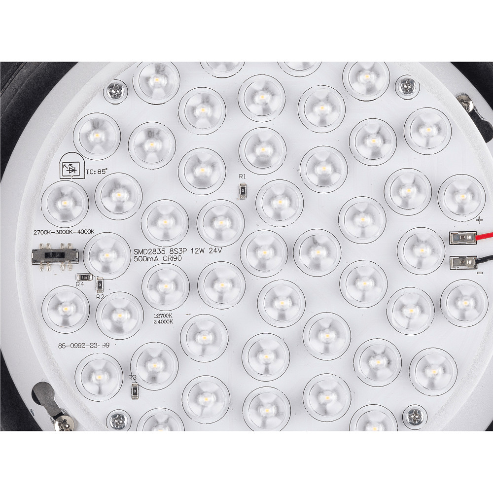 Die Leuchte bietet eine herausragende Lichtqualität mit einem Farbwiedergabeindex von 90-100 Ra, wodurch Farben natürlich und lebendig dargestellt werden. Die LED-Technik zeichnet sich durch eine hohe Lichtausbeute von 56,67 Lumen pro Watt aus, was für eine effiziente Nutzung der Energie spricht. Das integrierte LED-Betriebsgerät ist stromgesteuert und nicht austauschbar, sorgt jedoch für einen stabilen und langlebigen Betrieb der Leuchte.